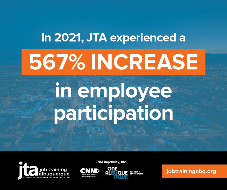 Job Training Albuquerque (JTA) is a fantastic economic development program, offering free skills training for smaller businesses in Albuquerque, NM. I began working to promote the program early in 2021, and from that time until the end of 2021, the program grew its participants by an incredible 567%.
